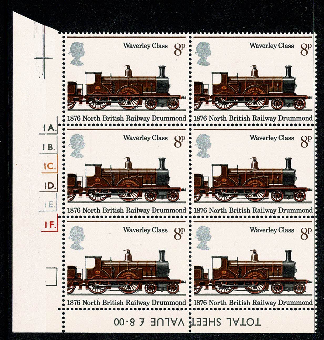 1975 Railways 8p. Cyl. 1A 1B 1C 1D 1E 1F p61 Dot block of six.