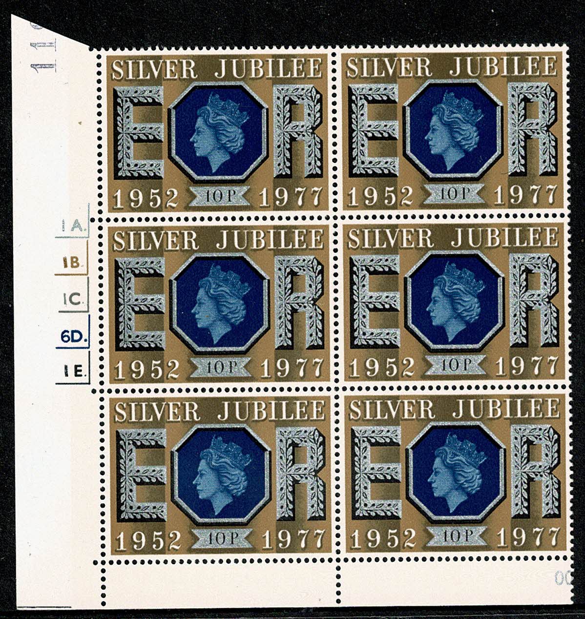 1977 Silver Jubilee 10p. Cyl. 1A 1B 1C 6D 1E dot block of six. SG 1035