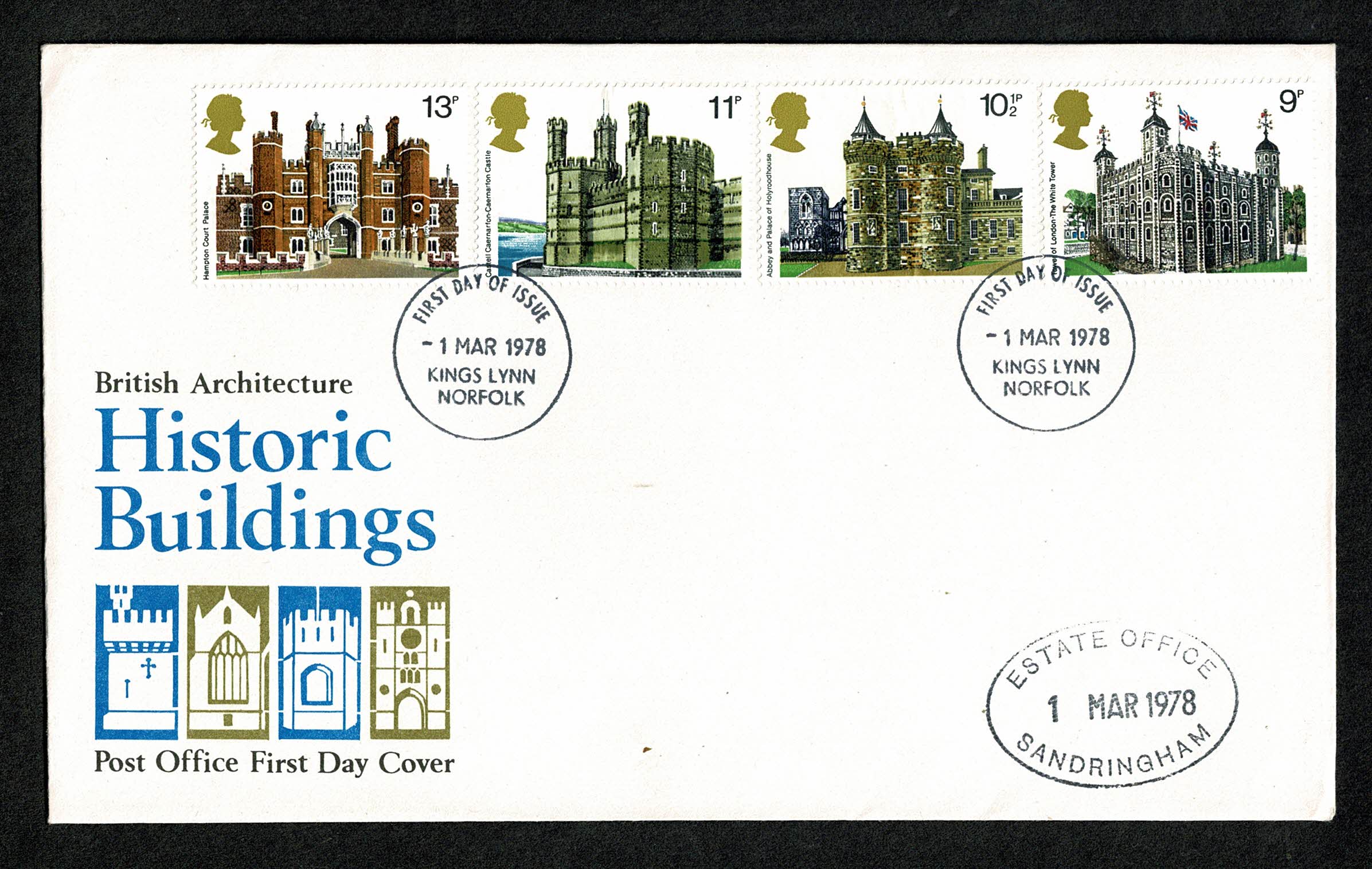 1978 Historic Buildings. Set on FDC with Fisrt Day of Issue CDS "Kings Lynn Norfolk" with "Estate Office Sandringham" Cachet. Illustrated unaddressed cover with some corner knocks. As illustrated.
