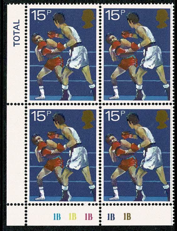 1980 Sports 15p. Plate 1B1B1B1B1B block of four.