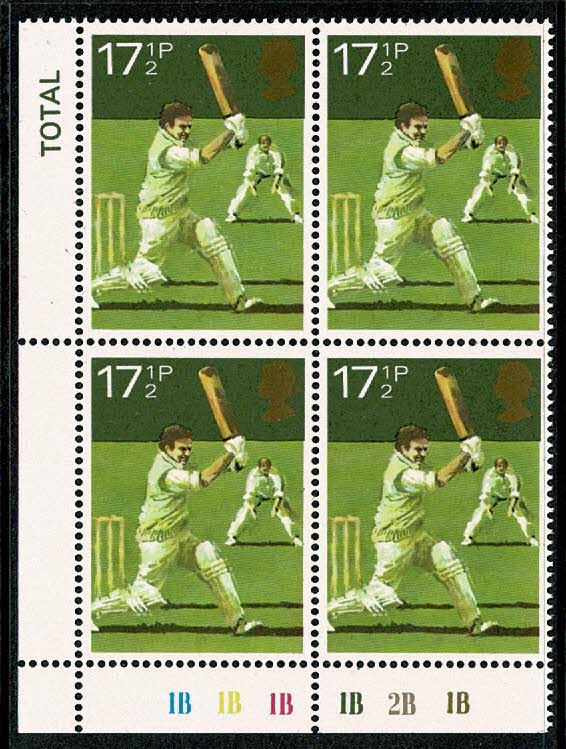 1980 Sports 17½p. Plate 1B1B1B1B2B1B block of four.