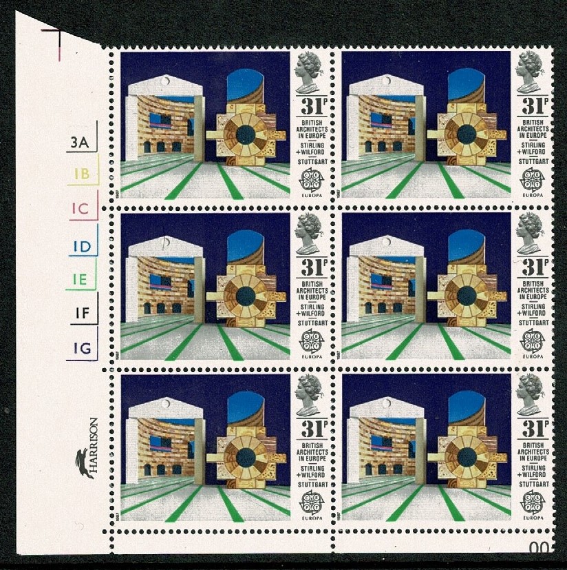 1987 British Architects in Europe 31p. Cyl. 3A 1B 1C 1D 1E 1F 1G No Dot block of six SG 1357