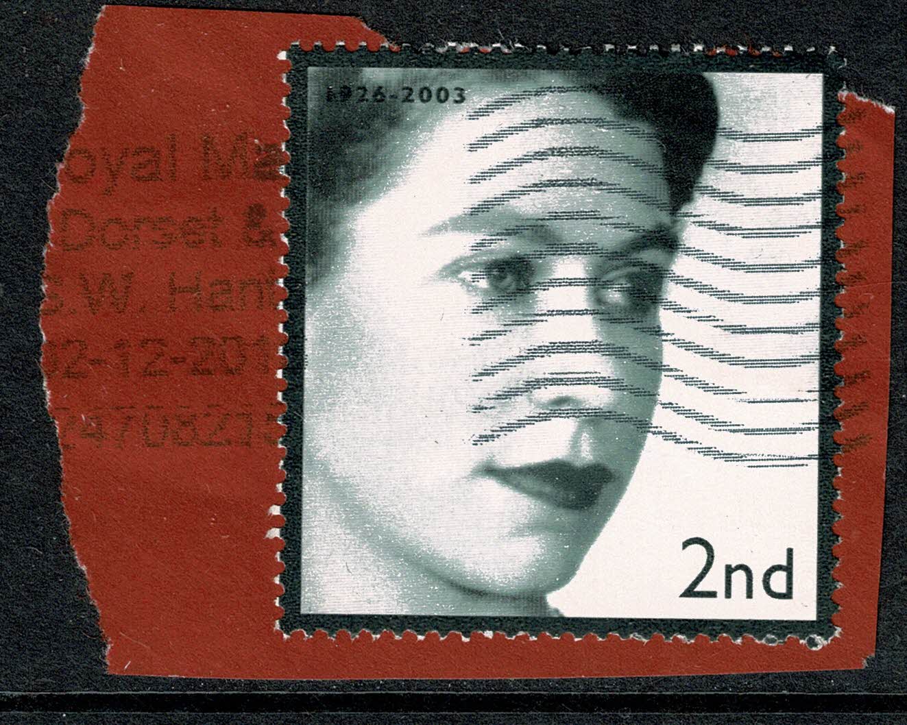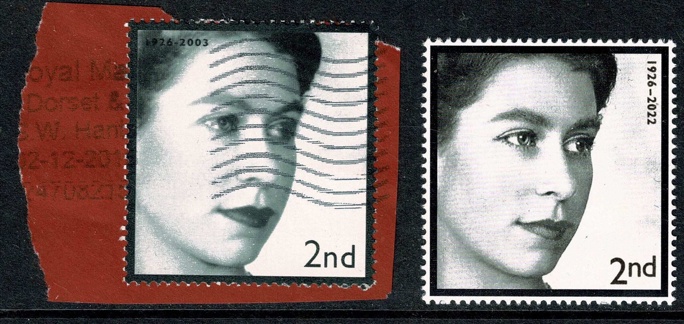 Value in different font to issued stamp and dates 1926 - 2003. Black border on perforated edge rather than inside perforated edge as on issued design.  Prepared it would seem as early as 2003.  The date on cancellation is partly missing and reads 02 - 12 - 201?. Illustrated with the issued 2nd class value from November 2022 issue at right.