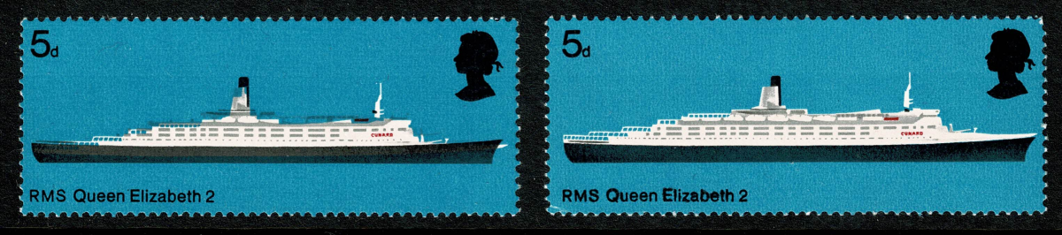 Unmounted mint marginal single with SHIFT OF TURQUOISE. At first glance appears confused as black, grey and red all appear shifted. Illustrated with normal at right.